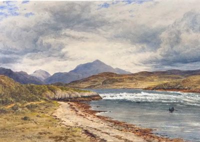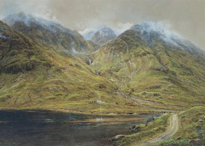 Waller Hugh Paton, originally hailing from Dunfermline as the son of damask designer , embarked on a transformative journey from textile industry to becoming a revered landscape painter. Initially following in his father’s footsteps, Joseph Neil Paton, Waller’s artistic spirit soon led him to pursue the serene and challenging world of painting. Paton was probably the most important of the many Scottish landscape painters of the period who were directly influenced by the lectures and writings of John Ruskin and the principles of the Pre-Raphaelite movement. As his artistic training was limited to informal tuition from John Adam Houston, he was essentially self taught, and this lack of academic training enabled him to accept Ruskin’s radical ideas. In an important lecture on Pre-Raphaelitism that Ruskin delivered in Edinburgh in November 1853, he said that the movement has but one principle, that of absolute uncompromising truth in all that it does, obtained by working everything, down to the most minute detail, from nature, and from nature only, every Pre-Raphaelite landscape background is painted to the last touch, in the open air, from the thing itself. His profound appreciation for the Scottish Highlands is vividly expressed through his watercolour and oil paintings. Elected to the Royal Scottish Academy in 1865, Waller Hugh Paton’s legacy is cemented by his extensive body of work, showcasing nearly 400 pictures that celebrate the natural beauty and intricate landscapes of Scotland.