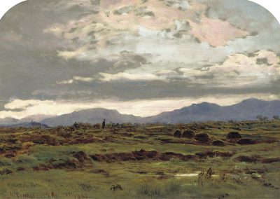 The painting contains an interesting detail – workmen on an embankment [see below]. Some believe this to be the road through Stronmilchan under construction, others workmen laying the railway embankment. The date the painting is signed is a significant pointer to the latter, as work on the railway line from Dalmally to Oban commenced just two months prior.